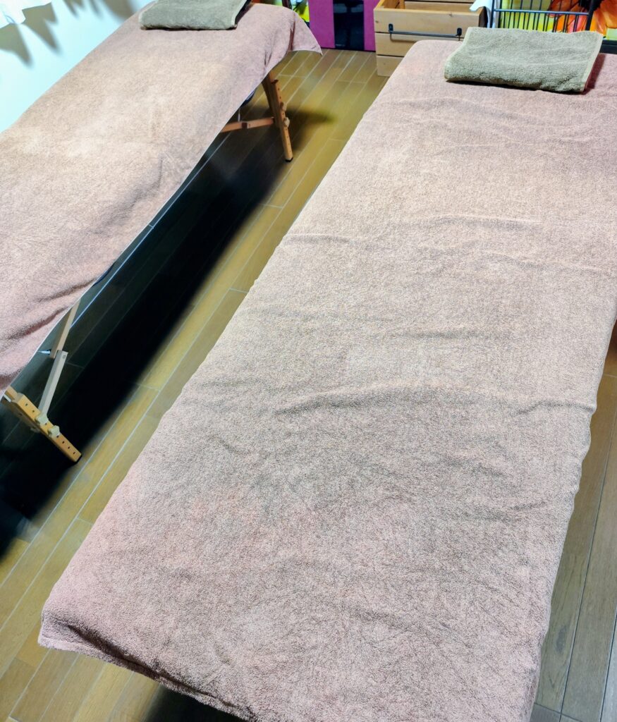 1人が美容鍼をしている間、もう1人は上半身の指圧を先にします。